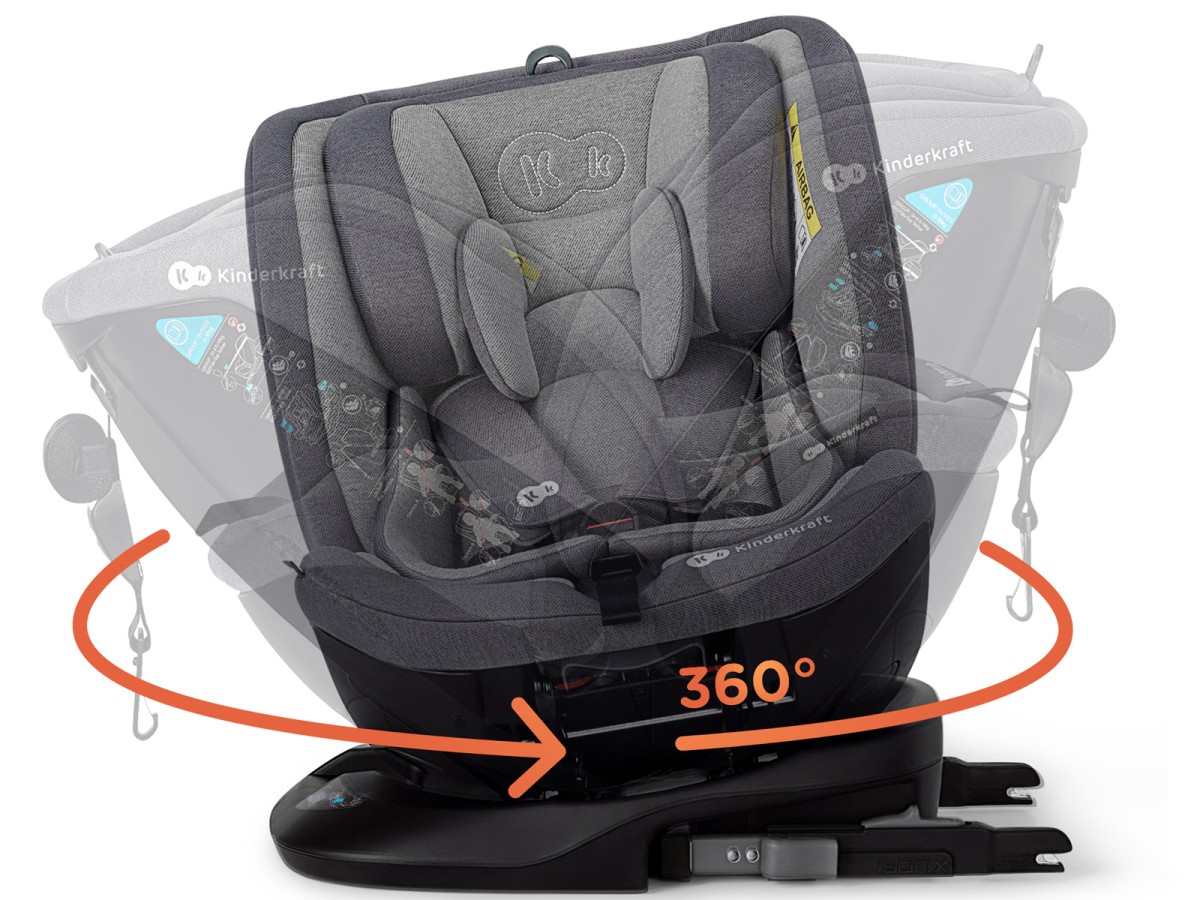 XPEDITION by Kinderkraft is a swivel car seat (360 degrees) with an integrated base – this enables you to easily and quickly turn the car seat sideways towards the door so you can effortlessly put your little one in and secure them using the safety harness. Depending on the age group, the car seat is installed using the ISOFIX system, TOP TETHER strap and/or the car's seat belts.