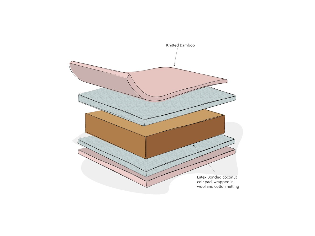 Luxurious and gloriously green, Obaby’s natural coir/wool mattress uses organic soft-touch bamboo fabric and has an inner core comprised of coconut coir, bonded with natural latex, which provides a naturally springy feel whilst being extremely resilient, durable and breathable. This is then topped with soft and luxurious lambswool that regulates body temperature and moisture for maximum comfort as well as being naturally hypoallergenic.