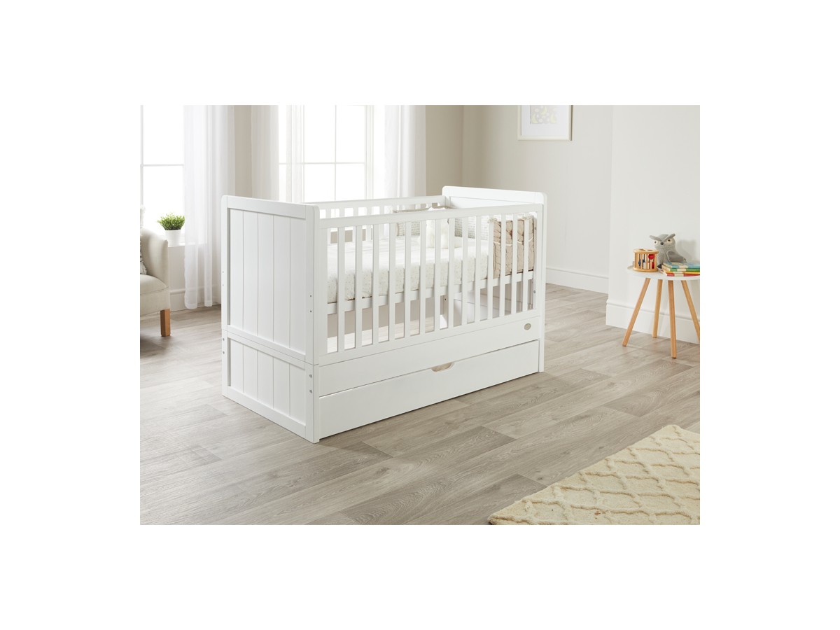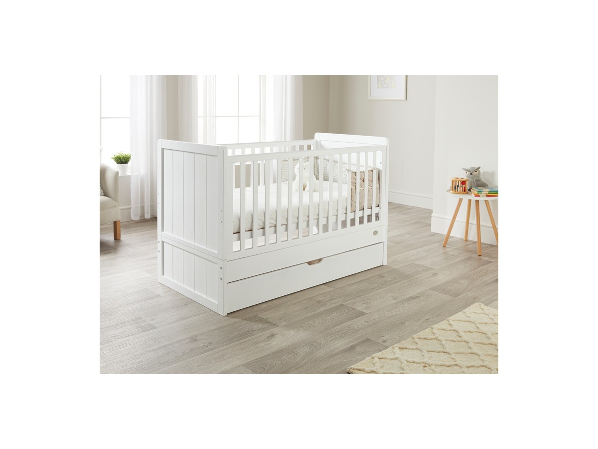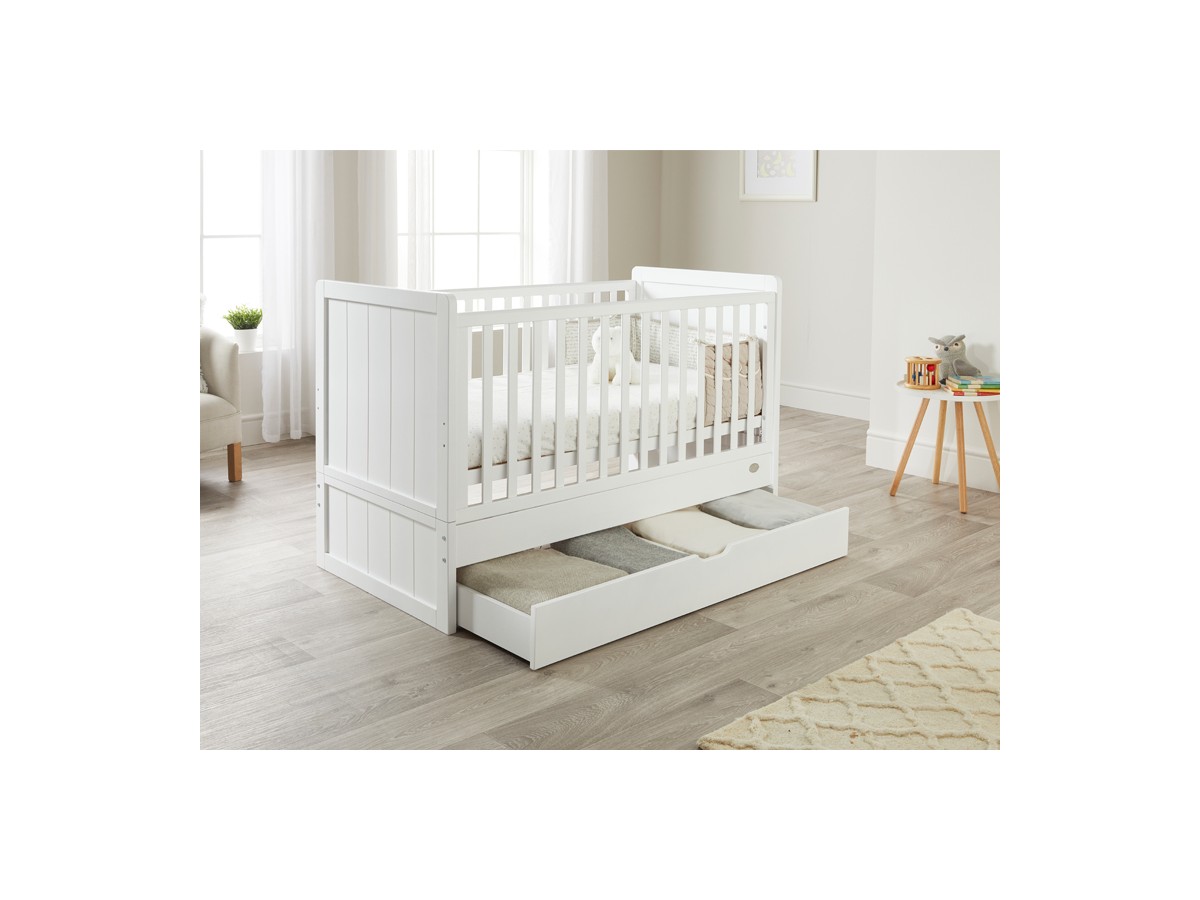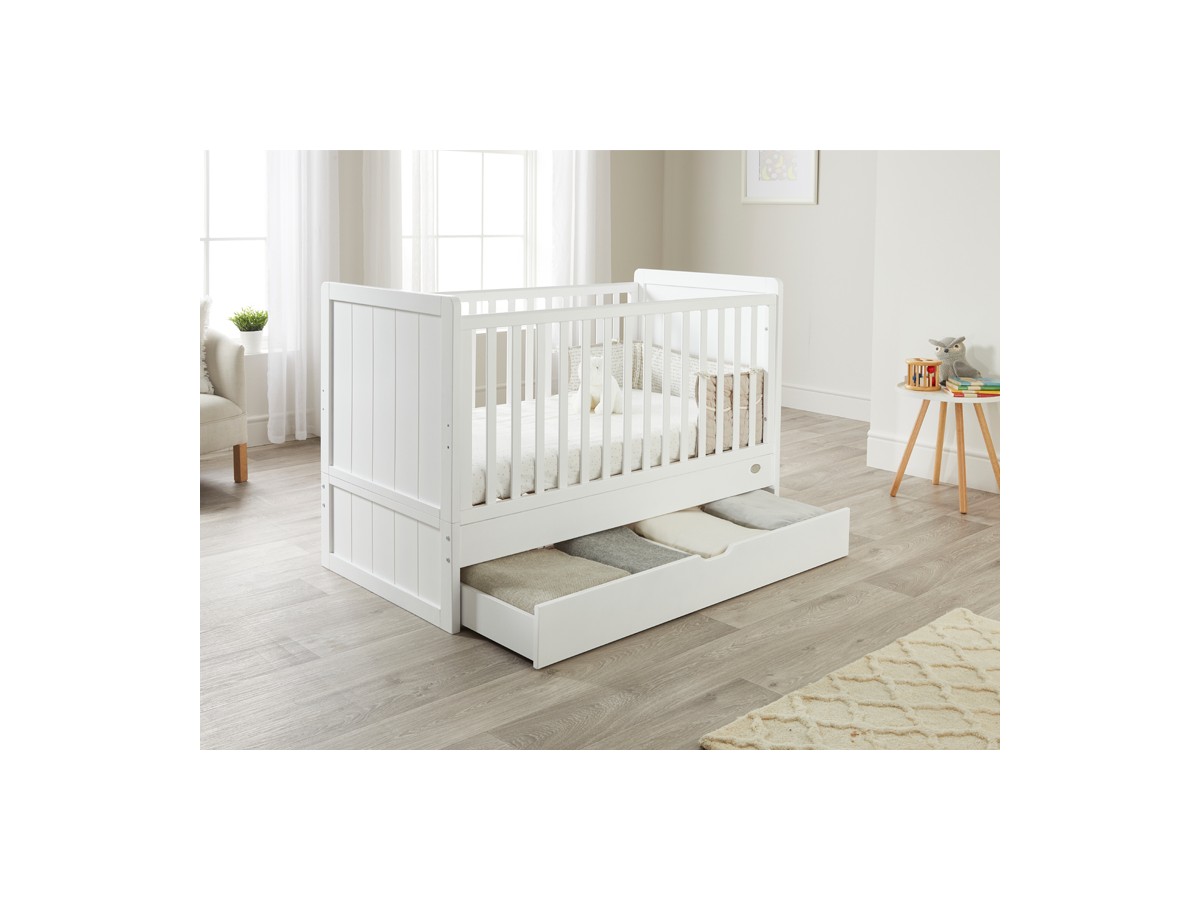 The ABI cot bed is the perfect modern cot bed to be in every newly decorated nursery, beautifully designed and highly made. With attention to details, this chunky cot bed will be the centre piece of every nursery room. Made from a high quality solid Beech wood on main frame and MDF on some part of the bed will not just to ensure its strong but to last long. This cot bed has a handy under bed independent drawer to maximise storage capacity. The cot bed has 3 adjustable mattress heights which can be easily adjust to suit your needs.