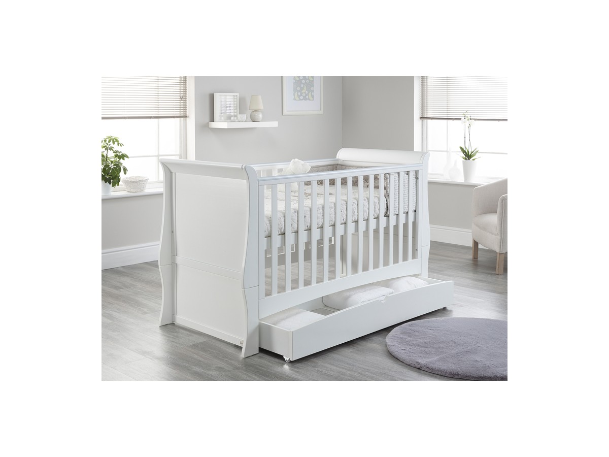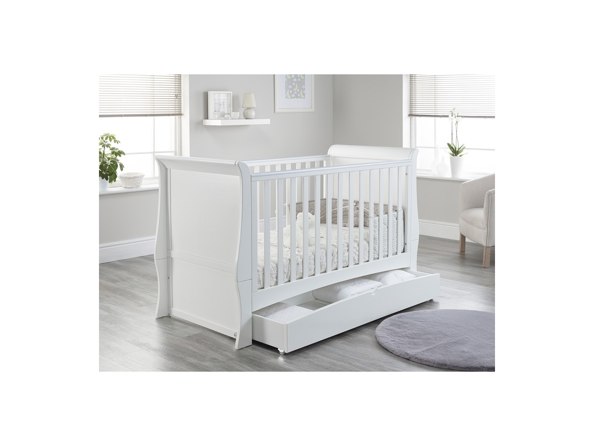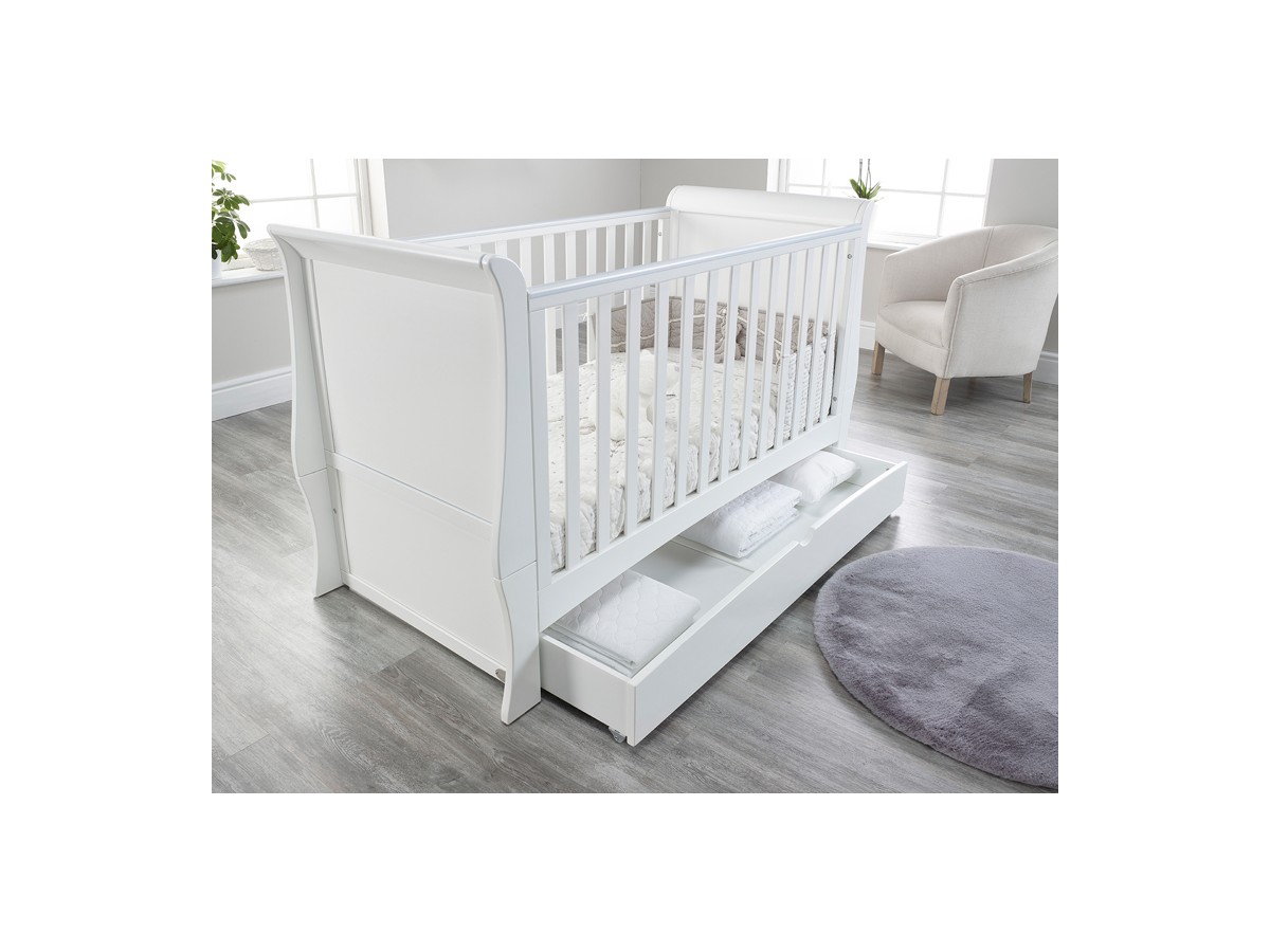 Top up your new nursery with this high quality Lillian Sleigh Cot Bed. With high attention given to its design, quality and finish; it will top up your smile when you see your child sleeping in it. The Cot Bed has 2 adjustable mattress position which can be easily adjusted to suit your child need. It can also easily converted into a Toddler Bed.