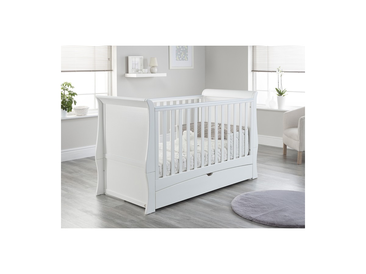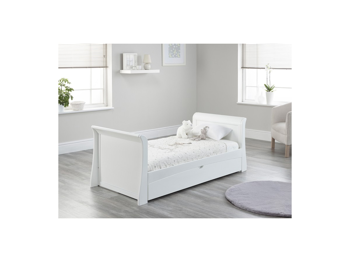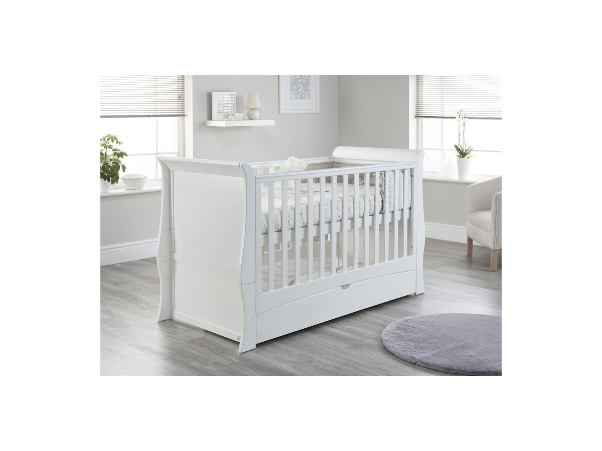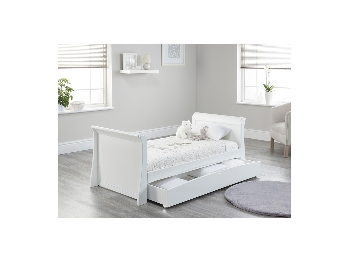 Top up your new nursery with this high quality Lillian Sleigh Cot Bed. With high attention given to its design, quality and finish; it will top up your smile when you see your child sleeping in it. The Cot Bed has 2 adjustable mattress position which can be easily adjusted to suit your child need. It can also easily converted into a Toddler Bed.