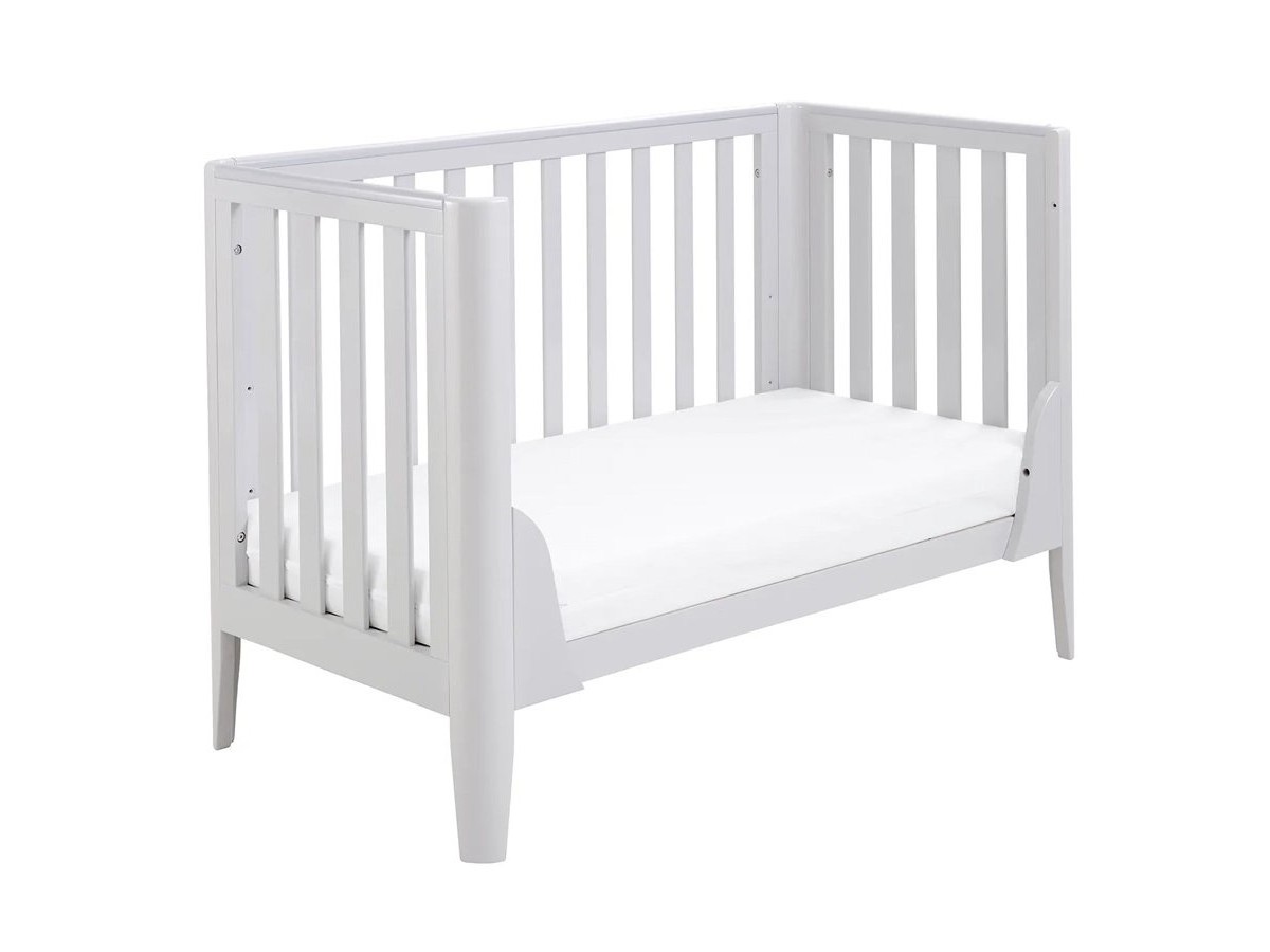 Made of solid pine. The Iris cot bed designed to last from birth until toddler age. 3 mattress base position for optimal sleep positions of early months, convert the cot to bed by remove the side panel, create a perfect toddler bed and a seater.