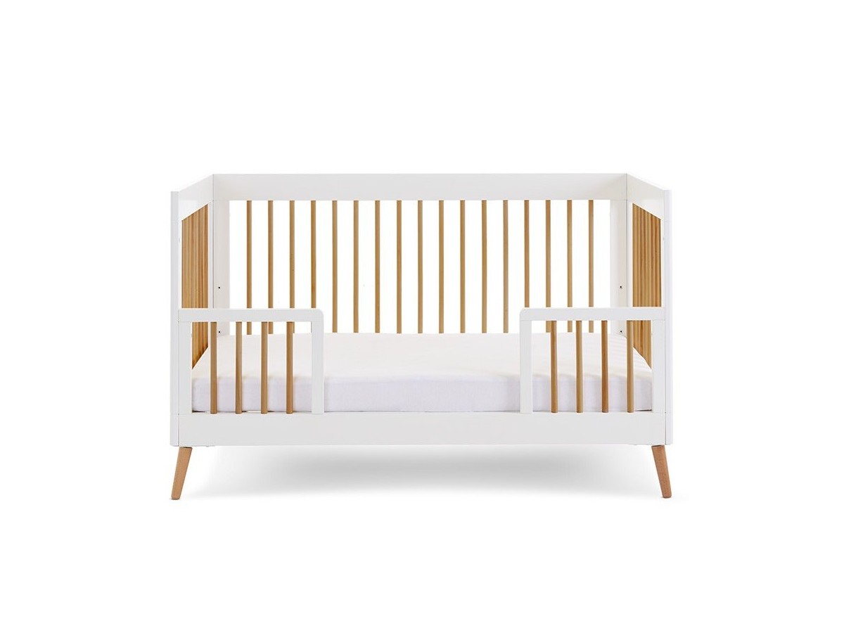 Suitable from birth, the Maya cot bed will grow with your little one. The top position of the three height-adjustable mattress base allows you to put down your baby with less pressure and strain applied to your back and as they develop and start to find their feet, you can maintain their safety by lowering the base. When your little one is ready to begin their transition, the included dual ended safety rail will provide reassurance and familiarity during an often daunting time and once they are used to their “big bed” this can be simply removed to create a stylish toddler bed.