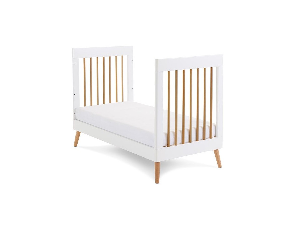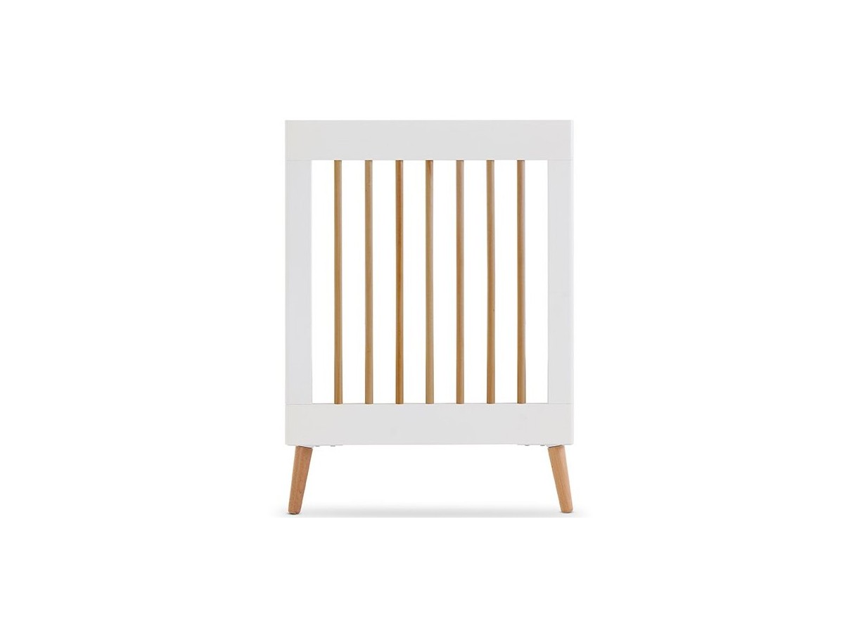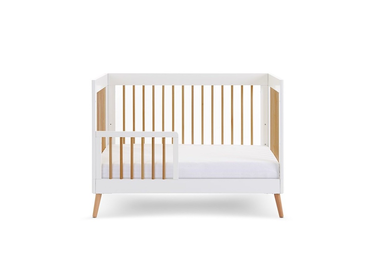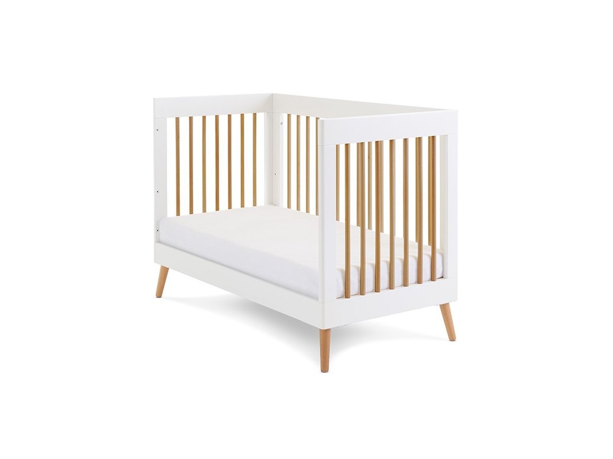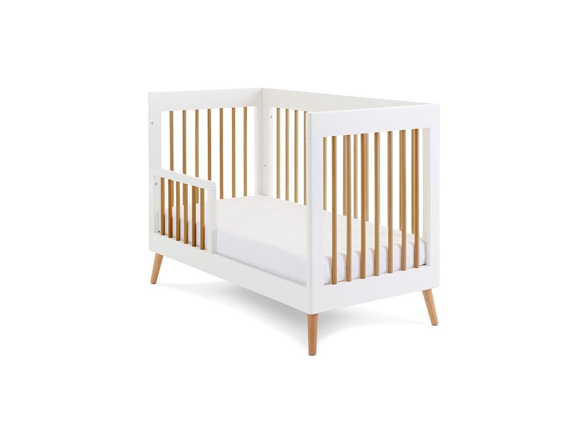 Featuring the same aesthetic and high-quality finish of the regular sized cot bed, the Maya Mini cot bed means families with a more compact nursery do not have to compromise when looking for a space-saving alternative. The top position of the three height-adjustable mattress base allows you to put down your baby with less pressure and strain applied to your back and as they develop and find their feet, you can maintain their safety by lowering the base. When your little one is ready to begin their transition, the included safety rail will provide reassurance and familiarity during an often daunting time and once they are used to their “big bed” this can be simply removed to create a stylish toddler bed.