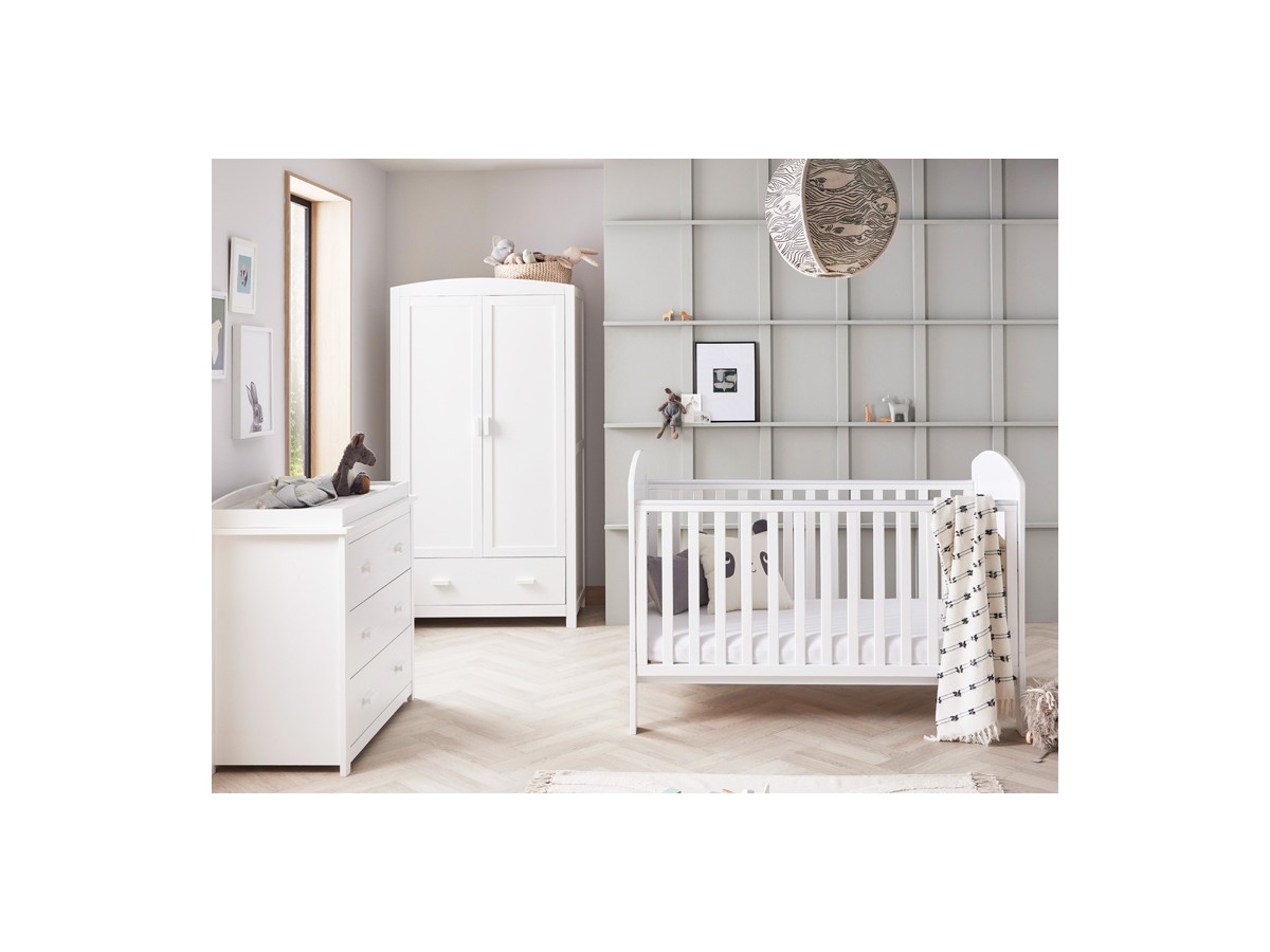 Introducing the Aston three-piece room set, which includes a beautiful dropside cot bed as well as a practical chest changer and spacious wardrobe. Everything you need to furnish a fashionable and cosy nursery for your child is included in this set.