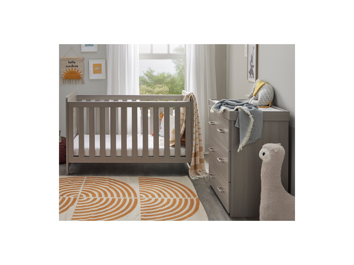 The Caro nursery collection is the ideal starting point for your nursery decor thanks to its timeless style and woodgrain finish. A stylish cot bed and versatile dresser are included in our Caro 2-piece nursery set. This cot will easily last through the first five years of your child's life thanks to its three height settings and ability to be transformed into a toddler bed. The dresser's changing top is detachable, transforming it from a practical baby changing unit into a chic dresser for displaying your child's treasured possessions.