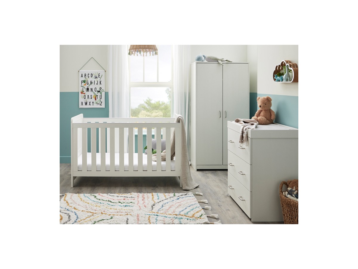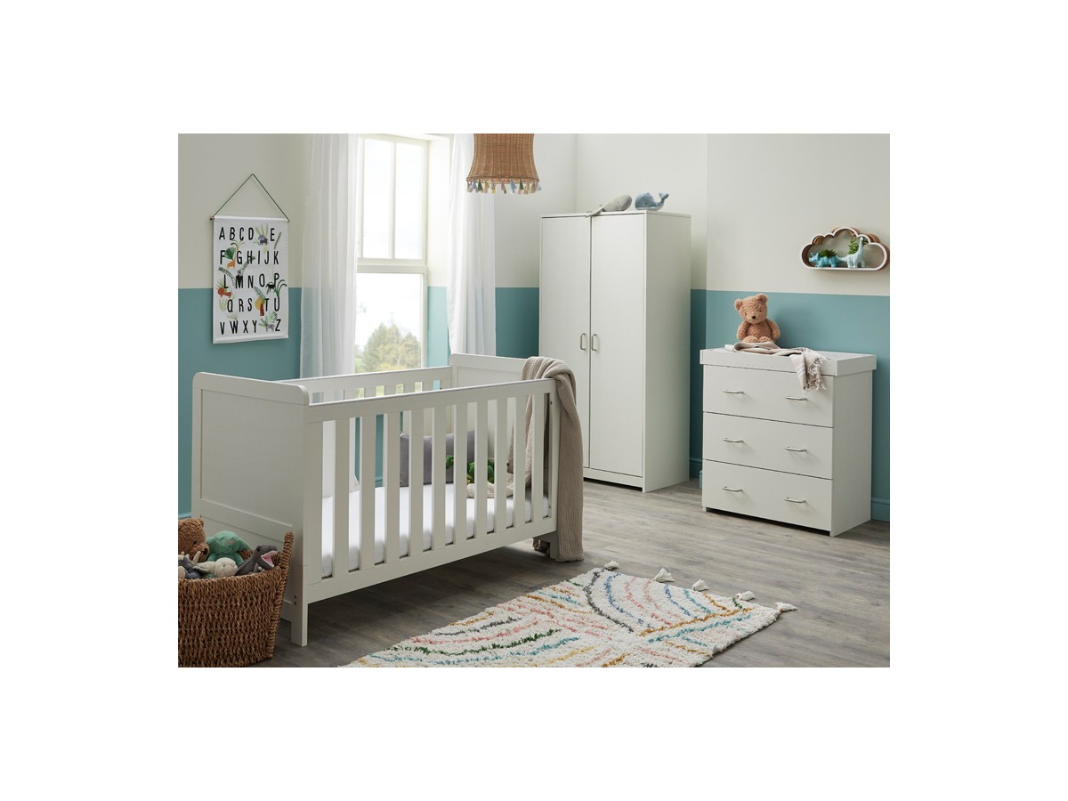 The Caro nursery collection is the ideal starting point for your nursery decor thanks to its timeless style and woodgrain finish. A stylish cot bed, versatile dresser, and double wardrobe are included in our Caro 3-piece nursery set. This cot will easily last through the first five years of your child's life thanks to its three height settings and ability to be transformed into a toddler bed. The dresser's changing top is detachable, transforming it from a practical baby changing unit into a chic dresser for displaying your child's treasured possessions. Finally, the double wardrobe is spacious enough to house your little one’s clothing with a shelf and the choice of either one or two rails.