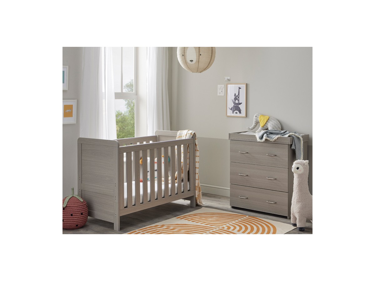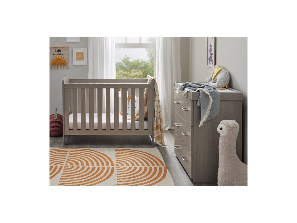 The Caro nursery collection is the ideal starting point for your nursery decor thanks to its timeless style and woodgrain finish. A stylish mini cotbed and versatile dresser are included in our Caro 2-piece nursery set. Designed for those with smaller rooms, the Caro Mini Cot Bed will last your little one until they are around 4 years old. Even though it’s a bit smaller than the Caro Cot Bed, it has all the same great features. The mini cot bed has 3 mattress positions, teething rails on both sides, and you can easily convert it into a toddler bed. The dresser’s changing top is detachable, transforming it from a practical baby changing unit into a chic dresser for displaying your child’s treasured possessions.