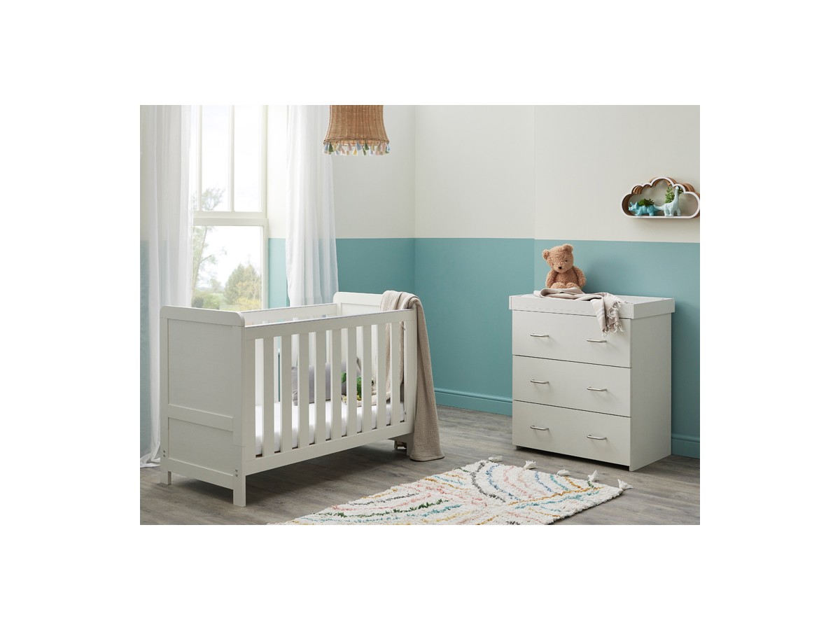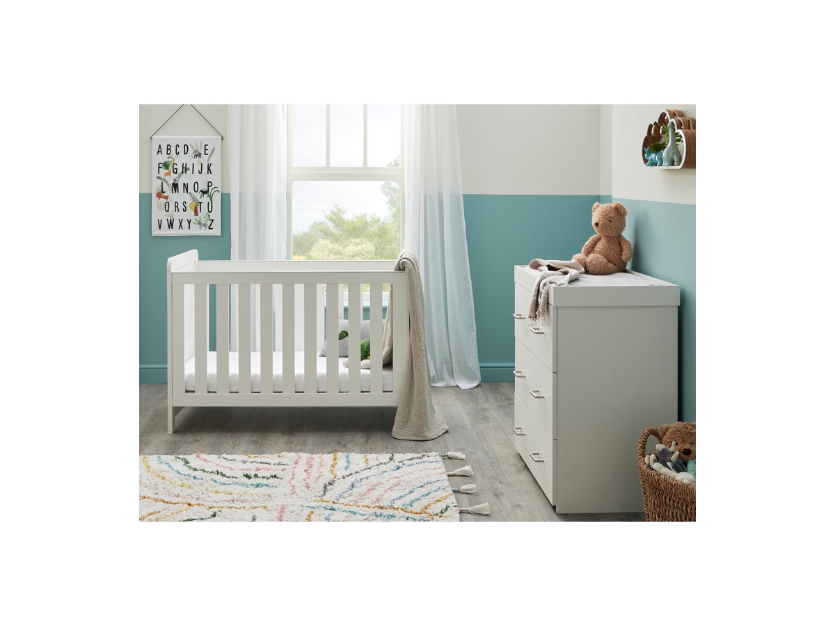 The Caro nursery collection is the ideal starting point for your nursery decor thanks to its timeless style and woodgrain finish. A stylish mini cotbed and versatile dresser are included in our Caro 2-piece nursery set. Designed for those with smaller rooms, the Caro Mini Cot Bed will last your little one until they are around 4 years old. Even though it’s a bit smaller than the Caro Cot Bed, it has all the same great features. The mini cot bed has 3 mattress positions, teething rails on both sides, and you can easily convert it into a toddler bed. The dresser’s changing top is detachable, transforming it from a practical baby changing unit into a chic dresser for displaying your child’s treasured possessions.