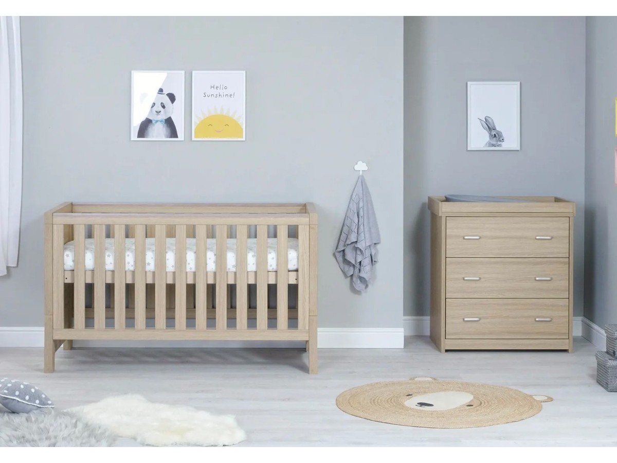 The Babymore Luno range offers a modern, warm, and clean design, with its neat lines and a beautifully textured Warm Oak wood effect finish. It will sit stylishly in your baby’s nursery. This 2-piece room set consists of the Luno cot bed, changing unit. There is also the option of a coordinated cot bed under drawer, and cot top changer.