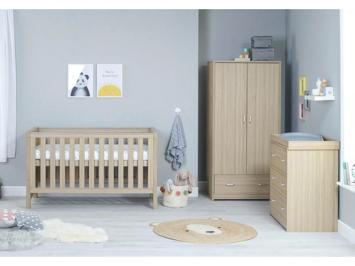 The Luno range offers a modern, warm, and clean design, with its neat lines and a beautifully textured Warm Oak wood effect finish. It will sit stylishly in your baby’s nursery. This 3-piece room set consists of Luno cot bed, changing unit and double wardrobe. There is also the option of a coordinated cot bed under drawer, and cot top changer.