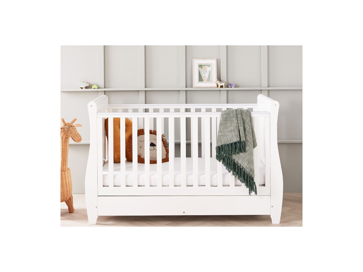The sleigh cot bed is a timeless and elegant piece of furniture that will grow with your child. Made from sturdy wood and finished in a classic hue, it features a sleigh design with curved edges and slatted sides. The cot bed has a 3-position adjustable base, allowing you to lower it as your baby grows. The cot bed also comes with teething rails to protect your baby's gums and teeth, and a handy storage drawer underneath to keep all your baby essentials close at hand. It can be converted into a toddler bed when your child is ready to make the transition from a cot.