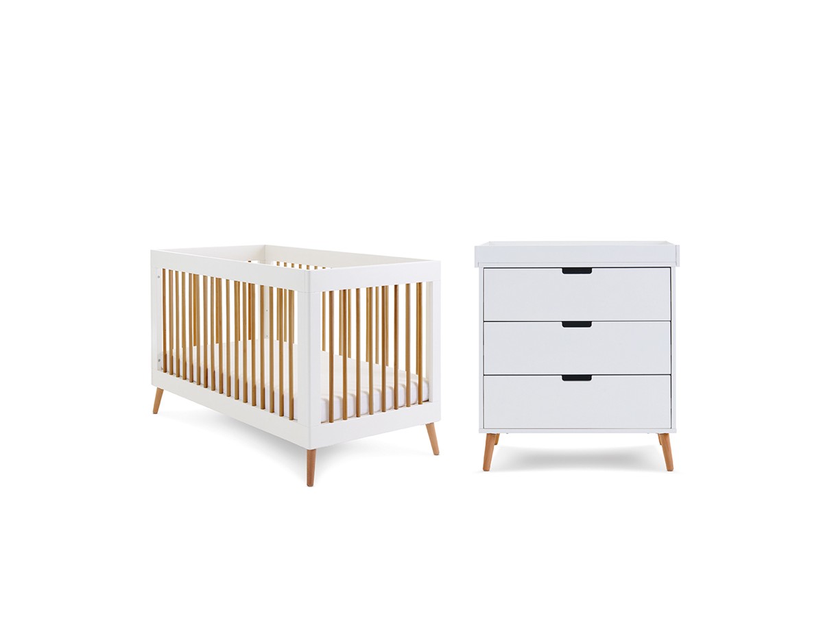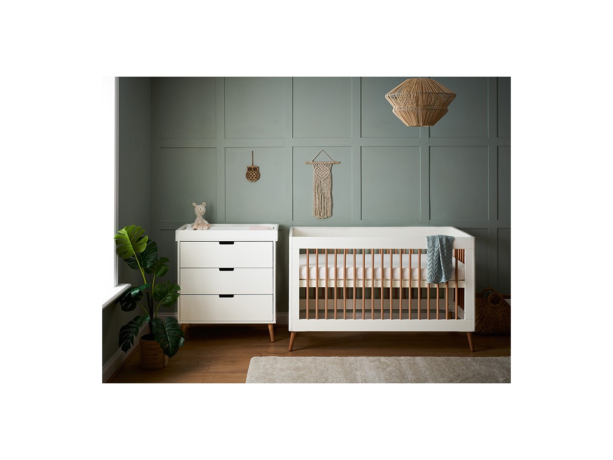 The Maya range from Obaby is inspired by Scandinavian design, featuring a clean-cut finish and two-tone colourway, making it the perfect addition for families looking to create a modern and stylish nursery. The Maya 2 piece room set consists of the Maya cot bed and changing unit.