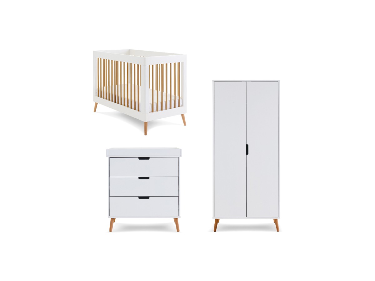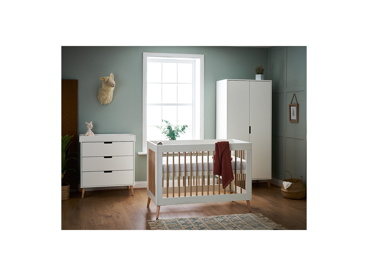 The Maya range from Obaby is inspired by Scandinavian design, featuring a clean-cut finish and two-tone colourway, making it the perfect addition for families looking to create a modern and stylish nursery. The Maya Mini 3 piece room set consists of the Maya Mini cot bed, changing unit and double wardrobe.