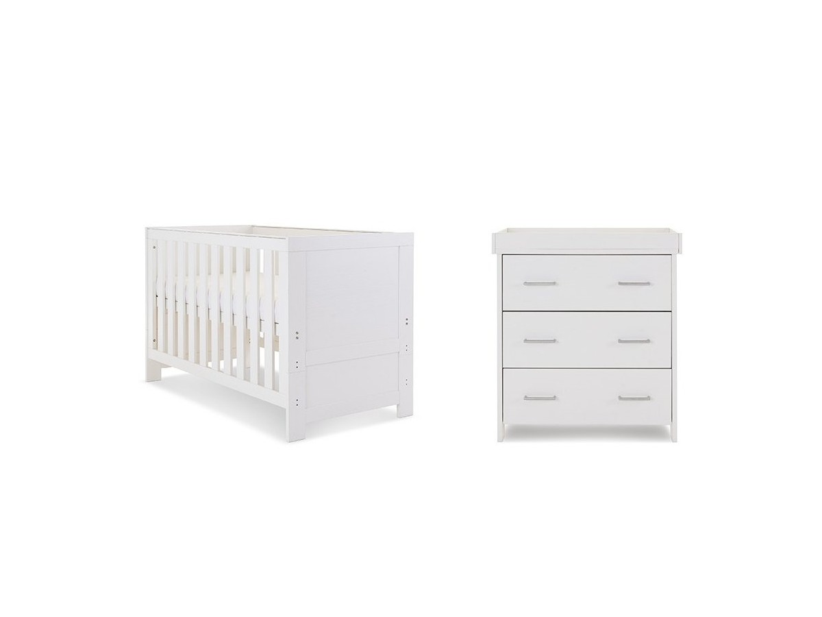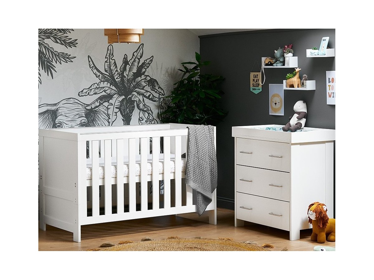 "The Obaby Nika range offers a contemporary design, due to its clean lines and textured oak effect finish, that will fit perfectly in today’s modern nursery. This 2 piece room set consists of Nika cot bed and changing unit.