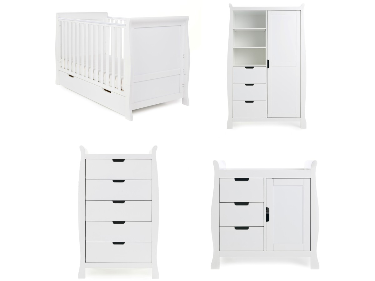 The Obaby Stamford furniture range offers families the perfect combination of style, quality and practicality. The Stamford Classic 4 piece room set consists of the beautiful Stamford Classic cot bed with under drawer, closed changing unit, double wardrobe and tall chest of drawers. All pieces feature the same elegant sleigh design that flows throughout the Stamford range.