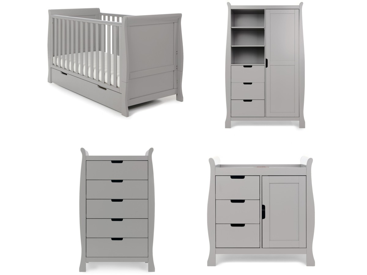 The Obaby Stamford furniture range offers families the perfect combination of style, quality and practicality. The Stamford Classic 4 piece room set consists of the beautiful Stamford Classic cot bed with under drawer, closed changing unit, double wardrobe and tall chest of drawers. All pieces feature the same elegant sleigh design that flows throughout the Stamford range.