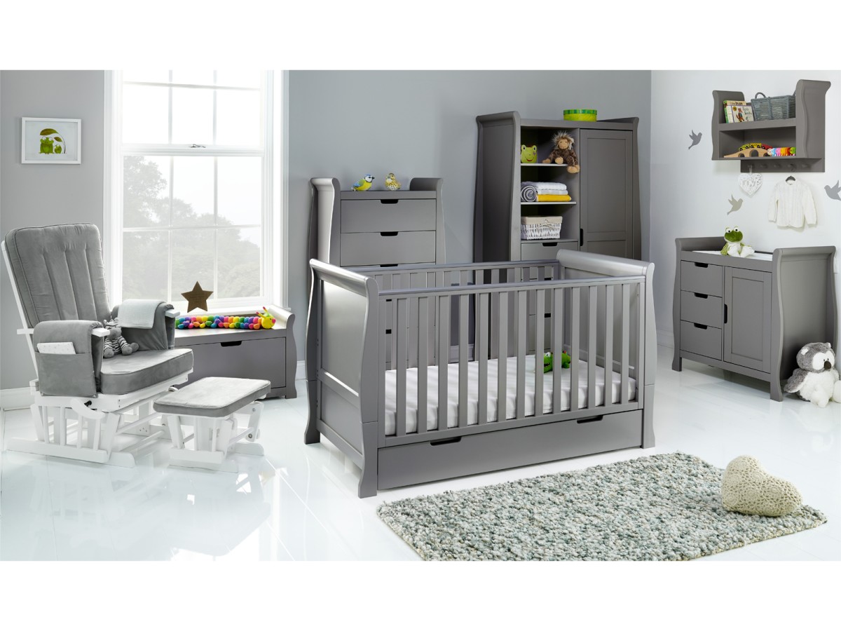 The Obaby Stamford furniture range offers families the perfect combination of style, quality and practicality. The Stamford Classic 7 piece room set consists of the beautiful Stamford Classic cot bed with under drawer, closed changing unit, double wardrobe, tall chest of drawers, toy box, shelf and deluxe reclining glider chair. All pieces feature the same elegant sleigh design that flows throughout the Stamford range.