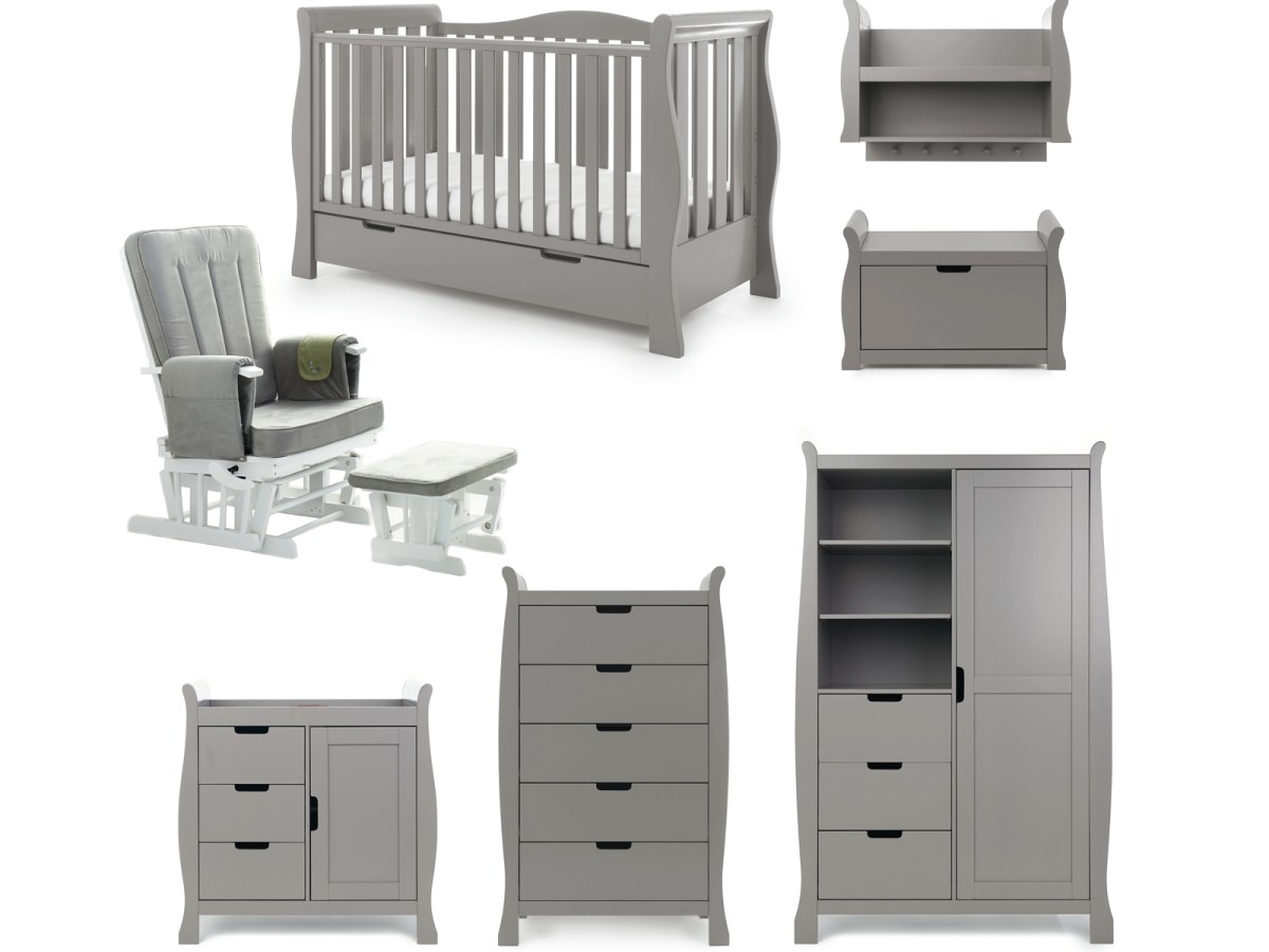 The Obaby Stamford furniture range offers families the perfect combination of style, quality and practicality. The Stamford Luxe 7 piece room set consists of the beautiful Stamford Luxe cot bed with under drawer, closed changing unit, double wardrobe, tall chest of drawers, toy box, shelf and deluxe reclining glider chair. All pieces feature the same elegant sleigh design that flows through the Stamford range.