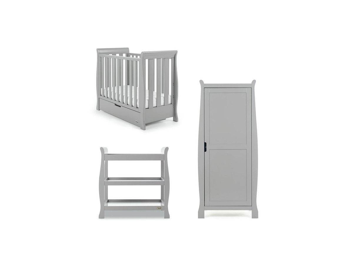 The Obaby Stamford furniture range offers families the perfect combination of style, quality and practicality. The Stamford Space Saver 3 piece room set consists of the beautiful and compact Stamford Space Saver cot with under drawer, open changing unit and single wardrobe. All pieces feature the same elegant sleigh design that flows through the rest of the Stamford range.