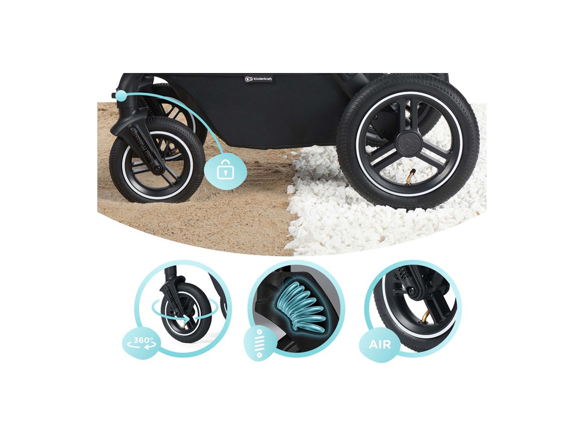 - Front: air-filled, rubber, 21 cm in diameter. They have shock absorption and rotate 360 degrees. They can also be locked to drive straight. They make it easier to manoeuvre the pushchair.