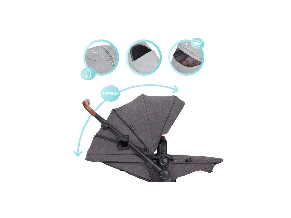 B-TOUR by Kinderkraft features a large, deep hood that can be extended. There's a hidden mesh panel under the material, which will ensure adequate airflow for your child on hot days. The hood is made of waterproof UPF50+ fabric, which means that B-TOUR is ideal irrespective of the time of year. Another attribute that improves comfort is the backrest, which can be adjusted to three positions using one hand– from the sitting position to the lie-flat position. Your child will enjoy this pushchair thanks to the materials, shock absorption and features designed to make walks more pleasant. You'll love B-TOUR for its set of accessories, practical solutions, ease of steering and ergonomic adjustable handle. And, of course, for its quick, simple folding with the seat attached.