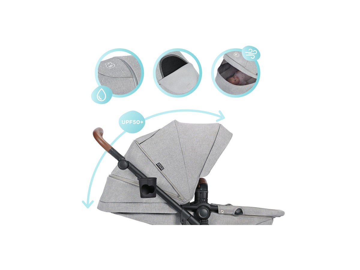 - The seat has a large extendable hood. It's made of waterproof UPF 50+ fabric. There's also a window through which you can see your child.