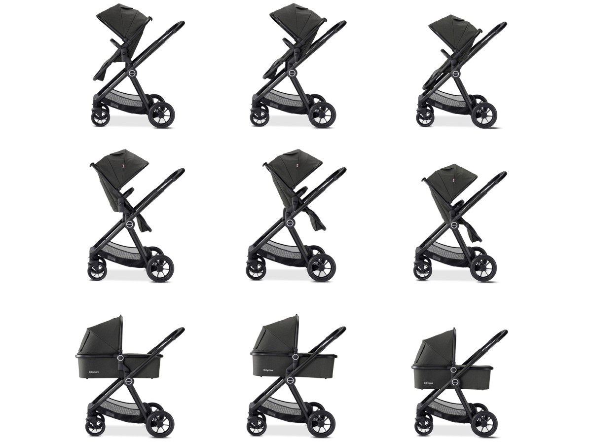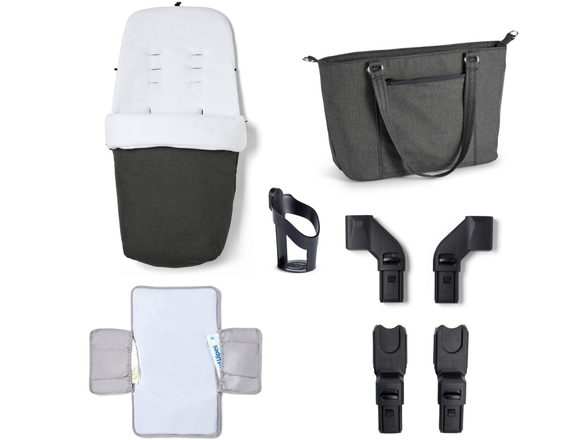 11 pieces bundle includes: Chassis, Seat, Elevator, Carrycot, Car Seat adaptors, Foot Muff, Seat Liner, Rain Cover, Changing Bag, Changing Matt, Cup Holder.