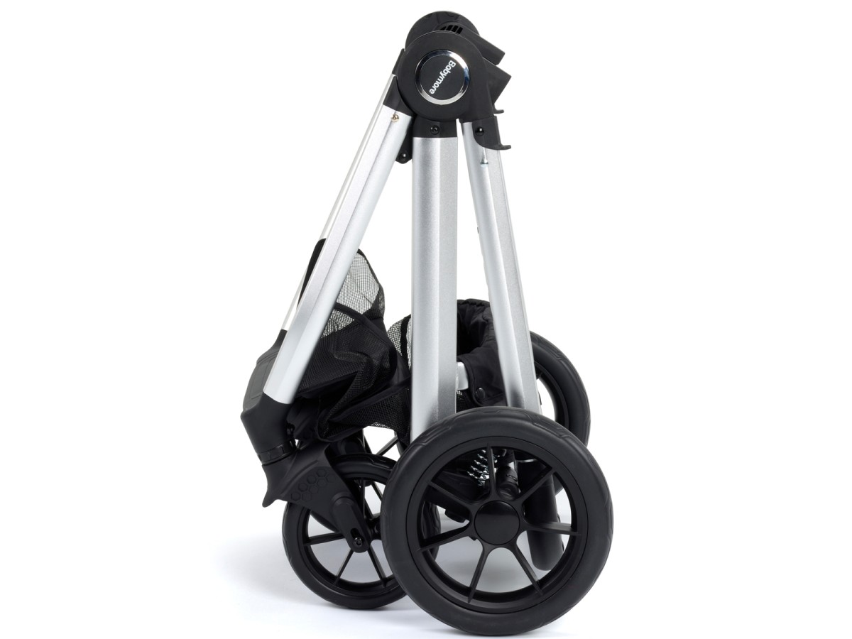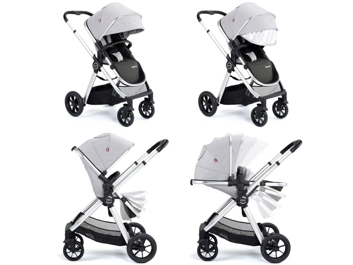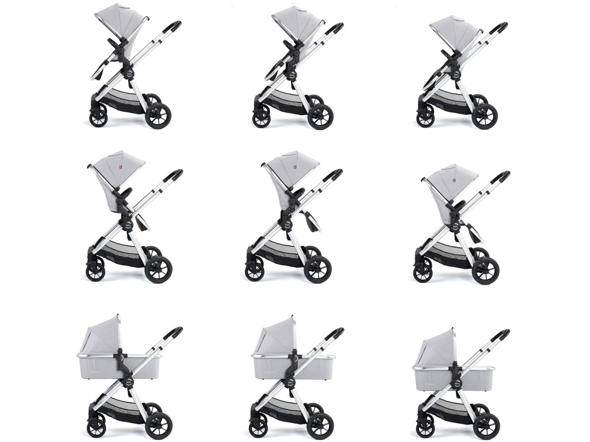 Our 11 piece luxury bundle includes: chassis, seat, elevators, carrycot, car seat adaptors, footmuff, seat liner, rain cover, changing bag, changing mat, and cup holder.