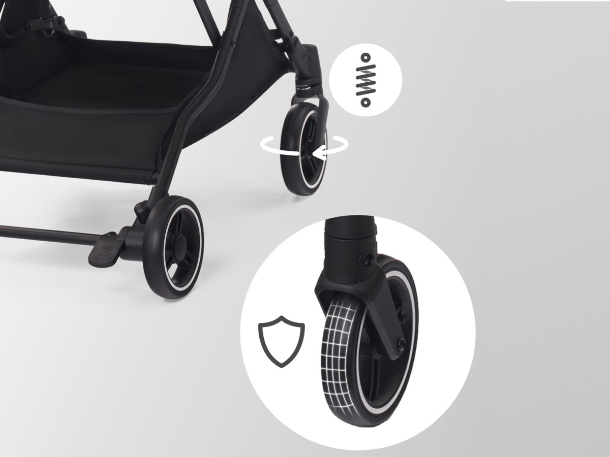 The nimble, maintenance-free wheels are puncture-proof and made of durable foam. Shock absorbers guarantee a pleasant ride, while the front wheels can rotate 360ᵒ, making the pushchair extremely manoeuvrable and easy to steer. Avoid any obstacle with ease.
